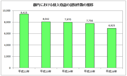 侵入窃盗犯の認知件数は減少傾向にありますが、都内だけで約7000件なっております。