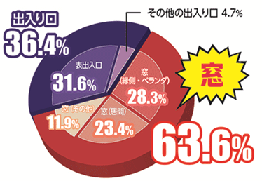 6割が窓から侵入されていることから、窓の防犯が防犯対策で最も重要である事がわかります。
